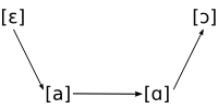 Cette règle a l’intérêt de poser le problème de l’ordre d’application des règles d’ouverture de /ɛ/ en /æ/ et de postériorisation de /a/ en /ɑ/ en syllabe ouverte (Picard 1978). Ces deux règles, ainsi que la règle de fermeture de /ɑ/ en /ɔ/, sont également intéressantes en ce qu’elles semblent illustrer un changement en chaîne, du moins en syllabe finale ouverte (Walker 1984) :